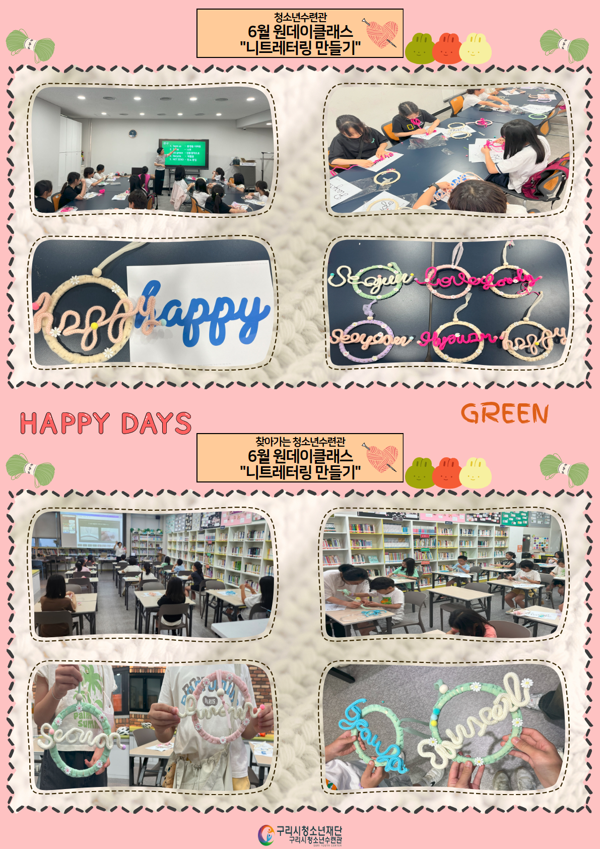 구리시청소년재단 청소년수련관에서는 6월 22일(토) 빛소어린이작은도서관, 6월 26일(수) 수련관 3층 멀티룸에서 '6월 원데이클래스 - 니트레터링 만들기' 프로그램을 진행했습니다.