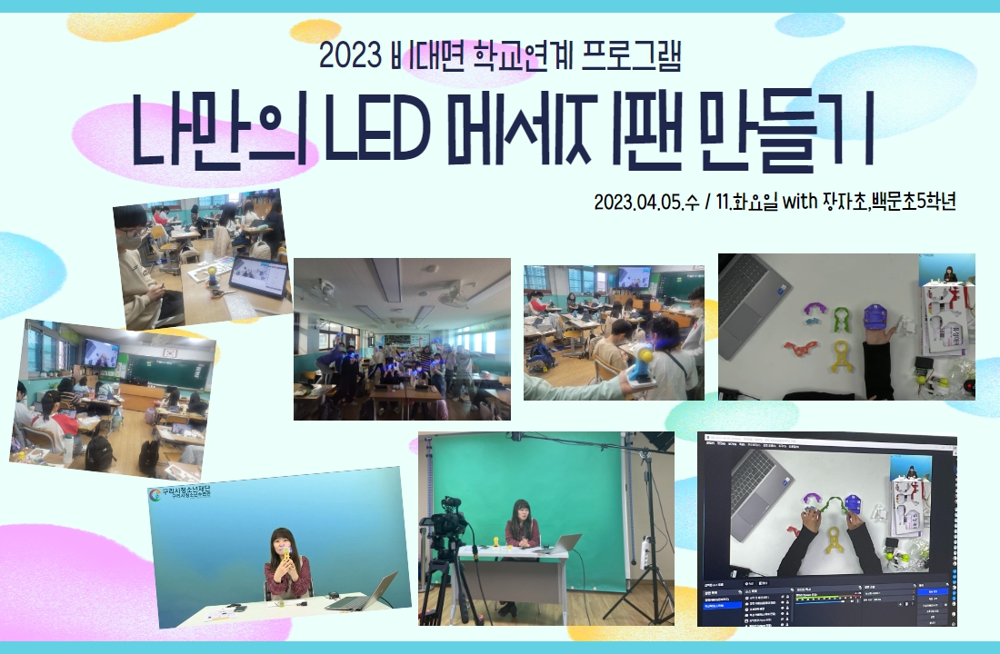 2023 비대면 학교연계 프로그램(나만의 LED메세지팬 만들기) - 장자초, 백문초 5학년 작성자 관리자 등록일자 2023년 5월 3일 14시 58분 41초 조회 386 23년활동사진(홈페이지) 1.jpg [ Size : 448.82KB , Down : 209 ] 미리보기 다운로드 목록보기