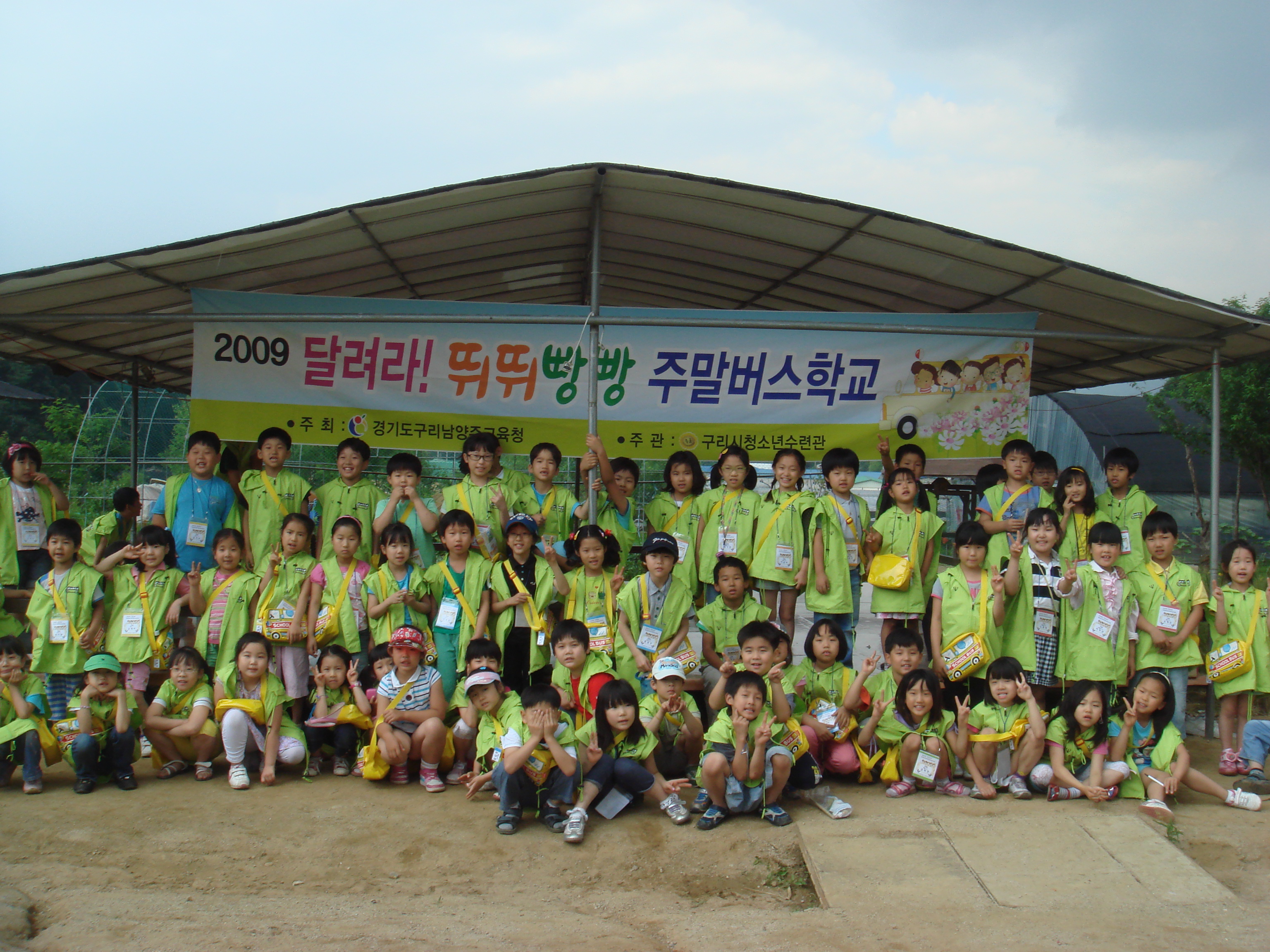 경기도구리남양주교육청이 주최하고 재)구리시청소년수련관이 주관하는「2009 달려라! 뛰뛰빵빵 주말버스학교」가 어린이들의 푸른 꿈을 가득 싣고 6.13(토) 구리시, 남양주시 지역 A권역 친구들이 오감을 만족하는 체험"지기마을"로 신나게 다녀왔습니다.