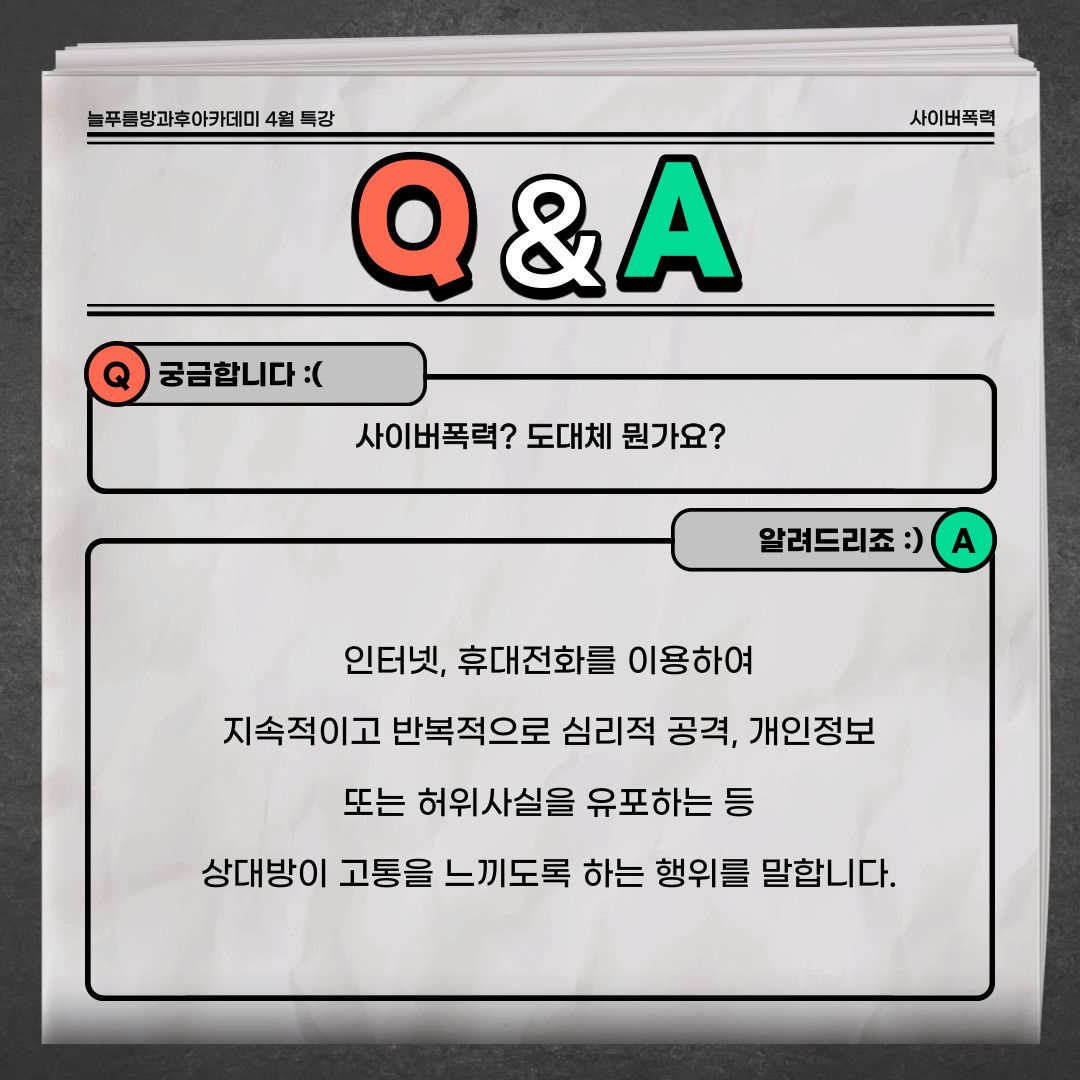 늘-하!🤗 이번주 목요일 늘푸름방과후아카데미에서 사이버폭력 특강을 진행했습니다.