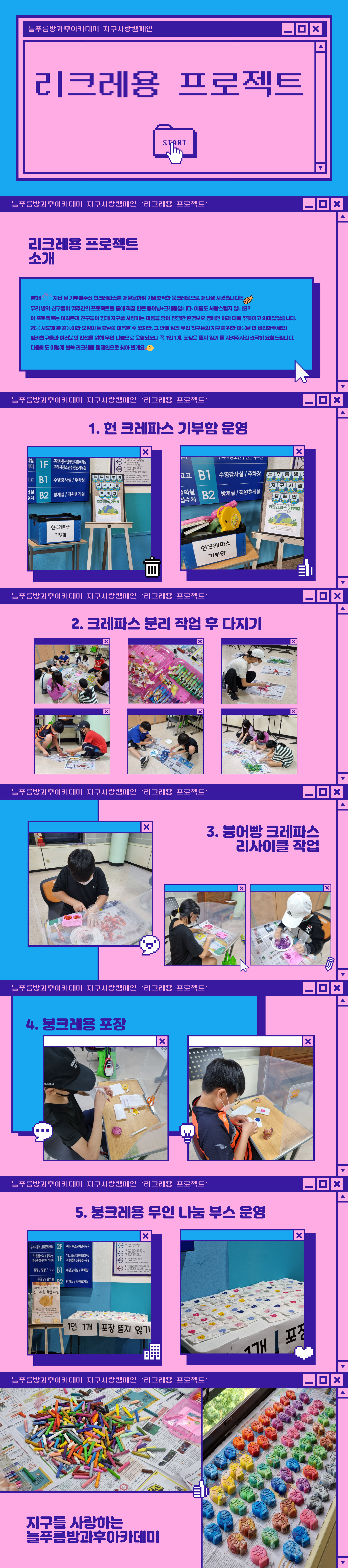 늘푸름방과후아카데미 지구사랑캠페인 '리크레용 프로젝트' 작성자 관리자 등록일자 2021년 9월 7일 15시 2분 38초 조회 673 001.jpg [ Size : 169.15KB , Down : 148 ] 미리보기 다운로드 리크레용.jpg [ Size : 3.25MB , Down : 266 ] 미리보기 다운로드 목록보기