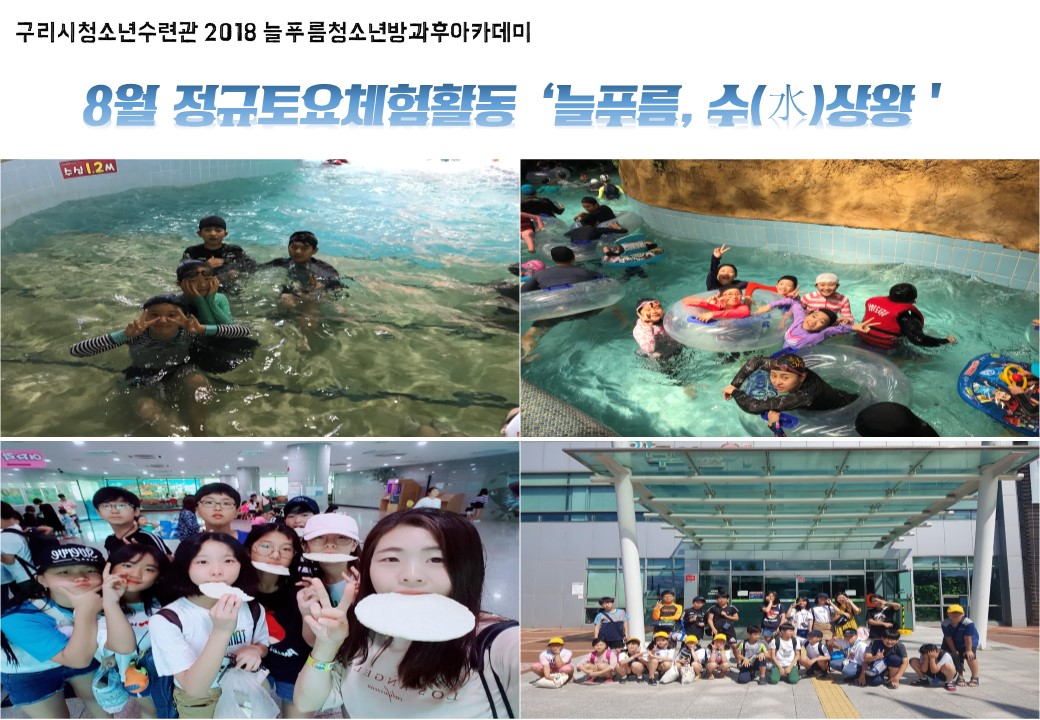 늘푸름청소년방과후아카데미 8월정규토요체험활동 작성자 관리자 등록일자 2018년 8월 20일 16시 1분 6초 조회 750 늘푸름청소년방과후아카데미에서는 8월 토요체험활동으로남양주시청소년수련관 아쿠와조이를 다녀왔습니다^^~!자유 물놀이를 통해 더위를 이겨내고, 친구들과의 추억을 쌓을 수 있는 신나는 시간을 가졌습니다. 8월토체.jpg [ Size : 227.93KB , Down : 135 ] 미리보기 다운로드 목록보기
