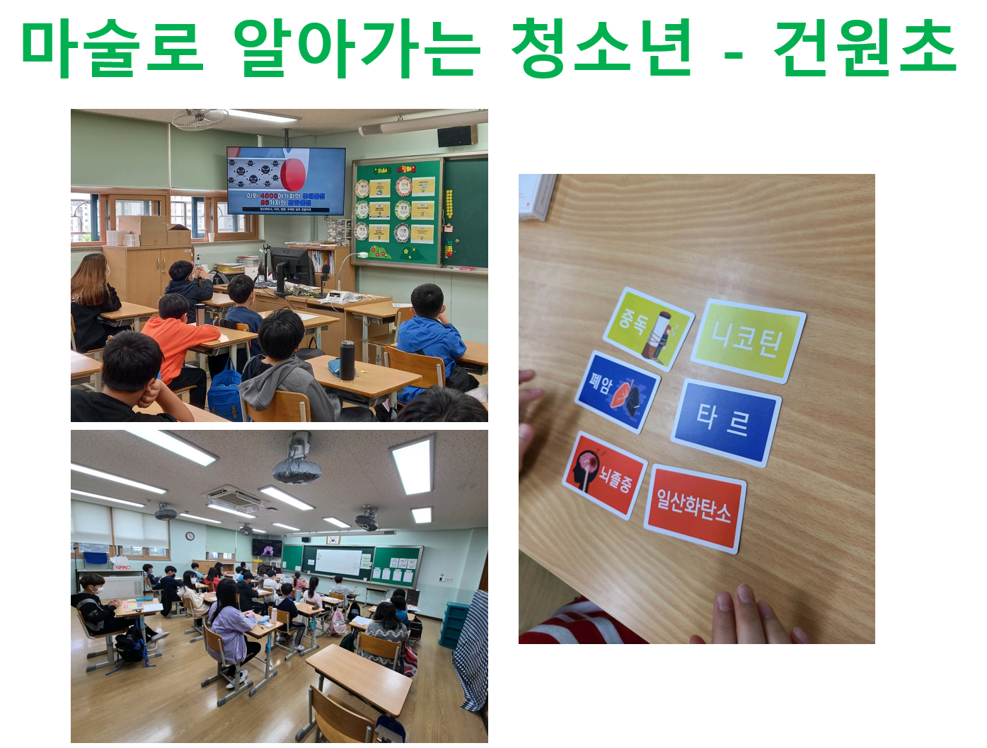 마술로 알아가는 청소년 [건원초등학교] 흡연예방교육이 2학년부터 6학년까지 거의 모든 전교생을 대상으로 진행되었습니다.