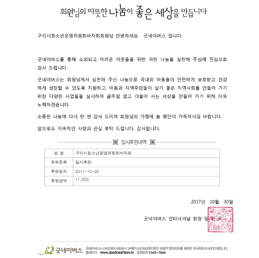 운영진이 수령한 금11,000원을 굿네이버스에 후원하였습니다.