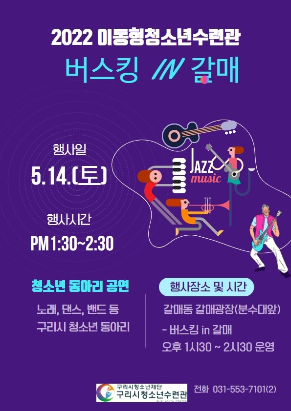 5월 14일(토) 구리시 갈매동 갈매광장에서 청소년 공연 동아리 버스킹 공연을 합니다.