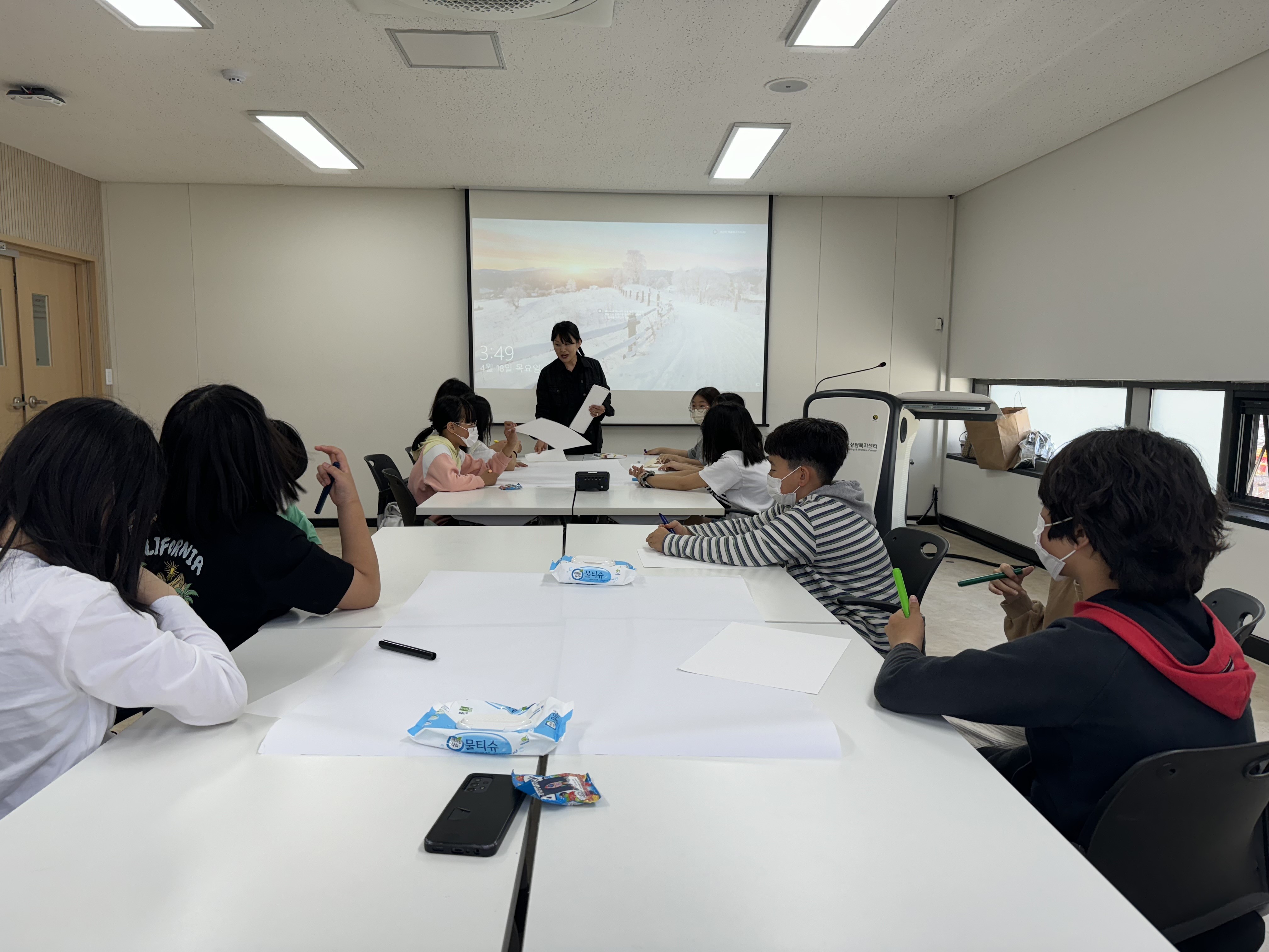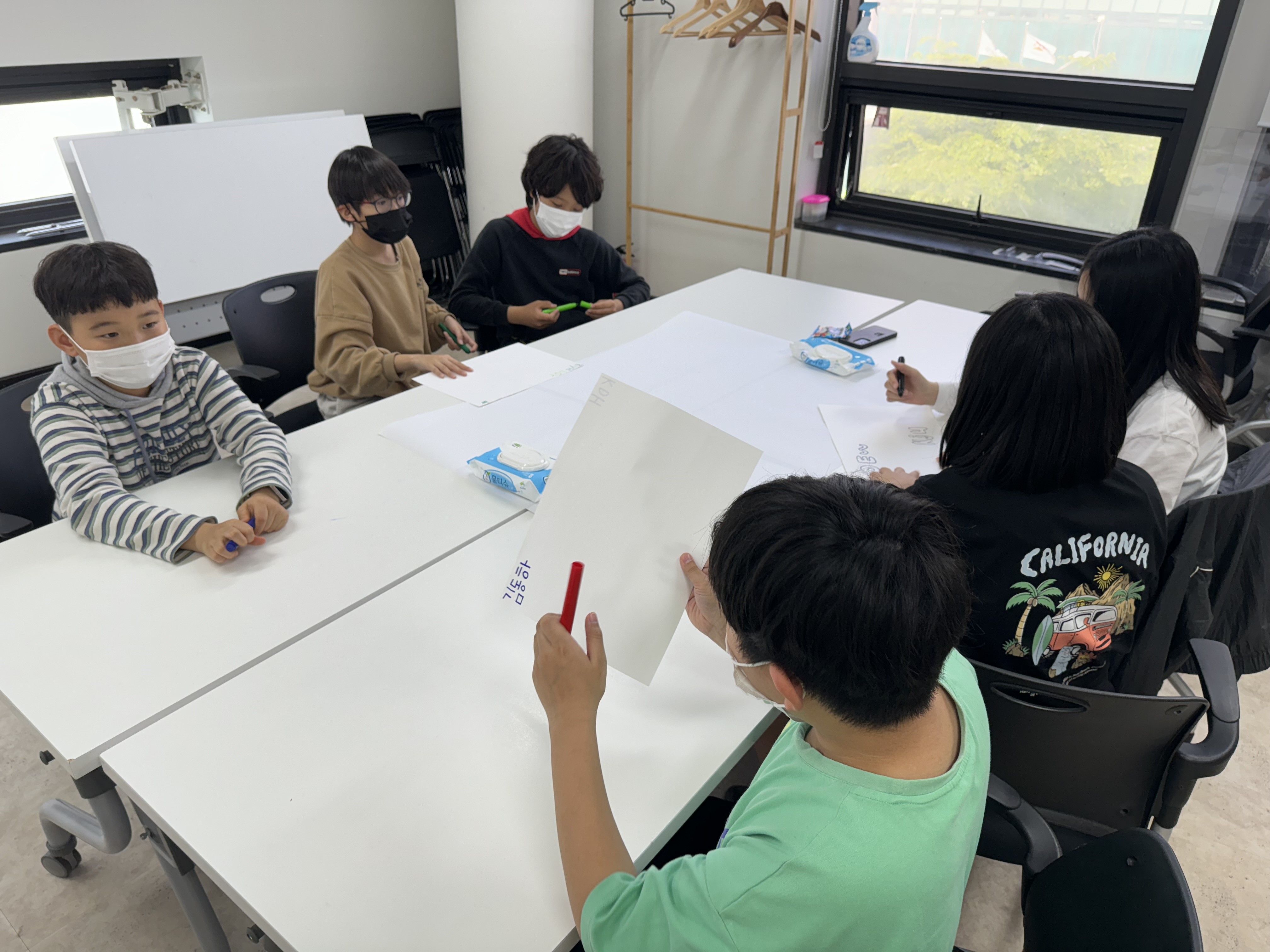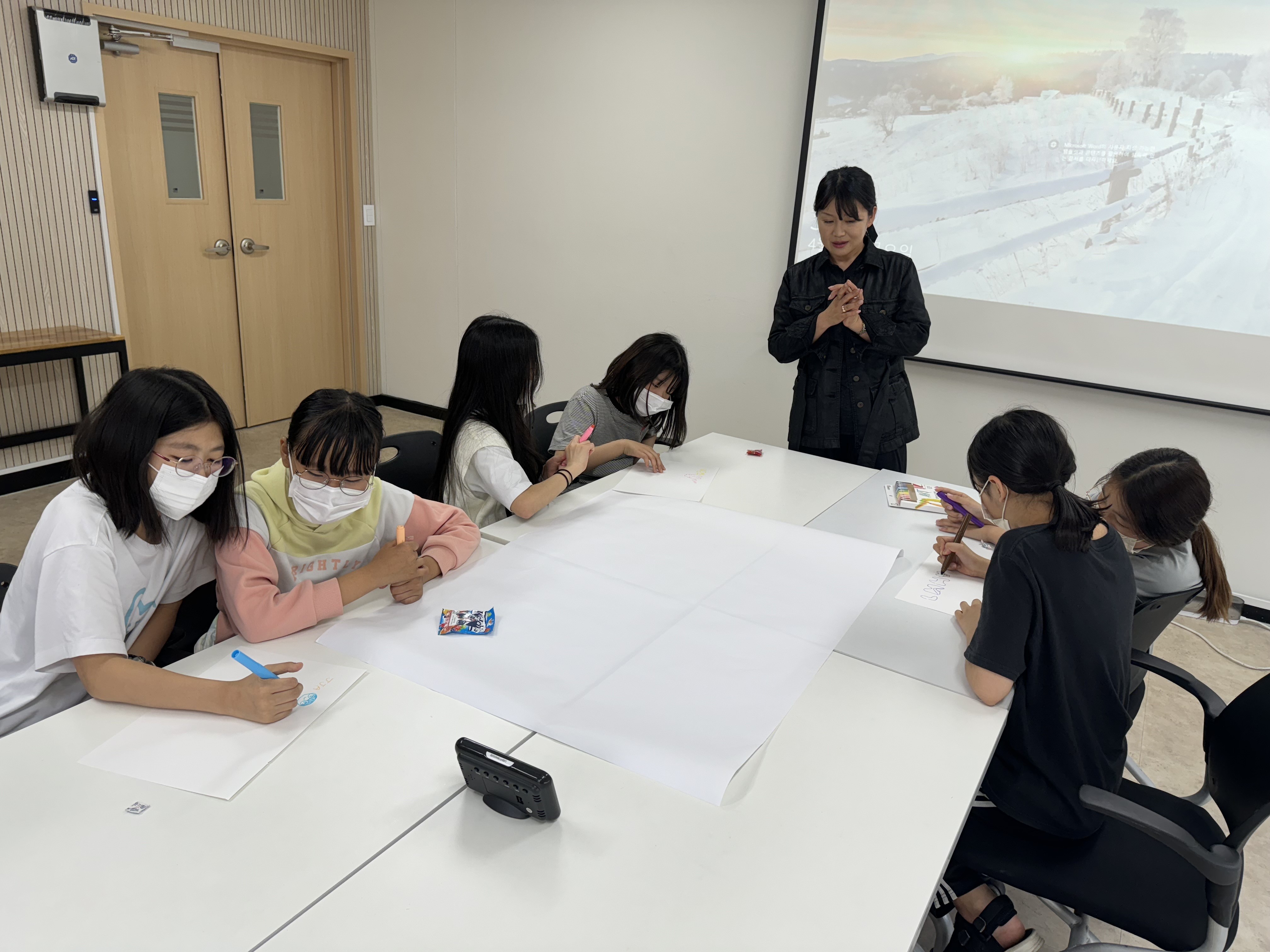 방과후아카데미 초등부(5,6학년 대상 )미술치료 수업이 진행되고 있습니다.[지금-여기, 우리 함께해요]라는 대주제와 나는 누구인가?, 공동화 이어 그리기, 여기는 실험실, 내가 가치를 두는 것 등의 4차시 수업을 통해 자기개방과 격려와 지지 등의 상호작용을 경험함으로써 자기이해 및 자기수용을 할 수 있고 타인과 어울리는 방법을 이해하고 터득하여 자기성장과 학교생활에 원만하게 적응하는 것이 목표입니다.