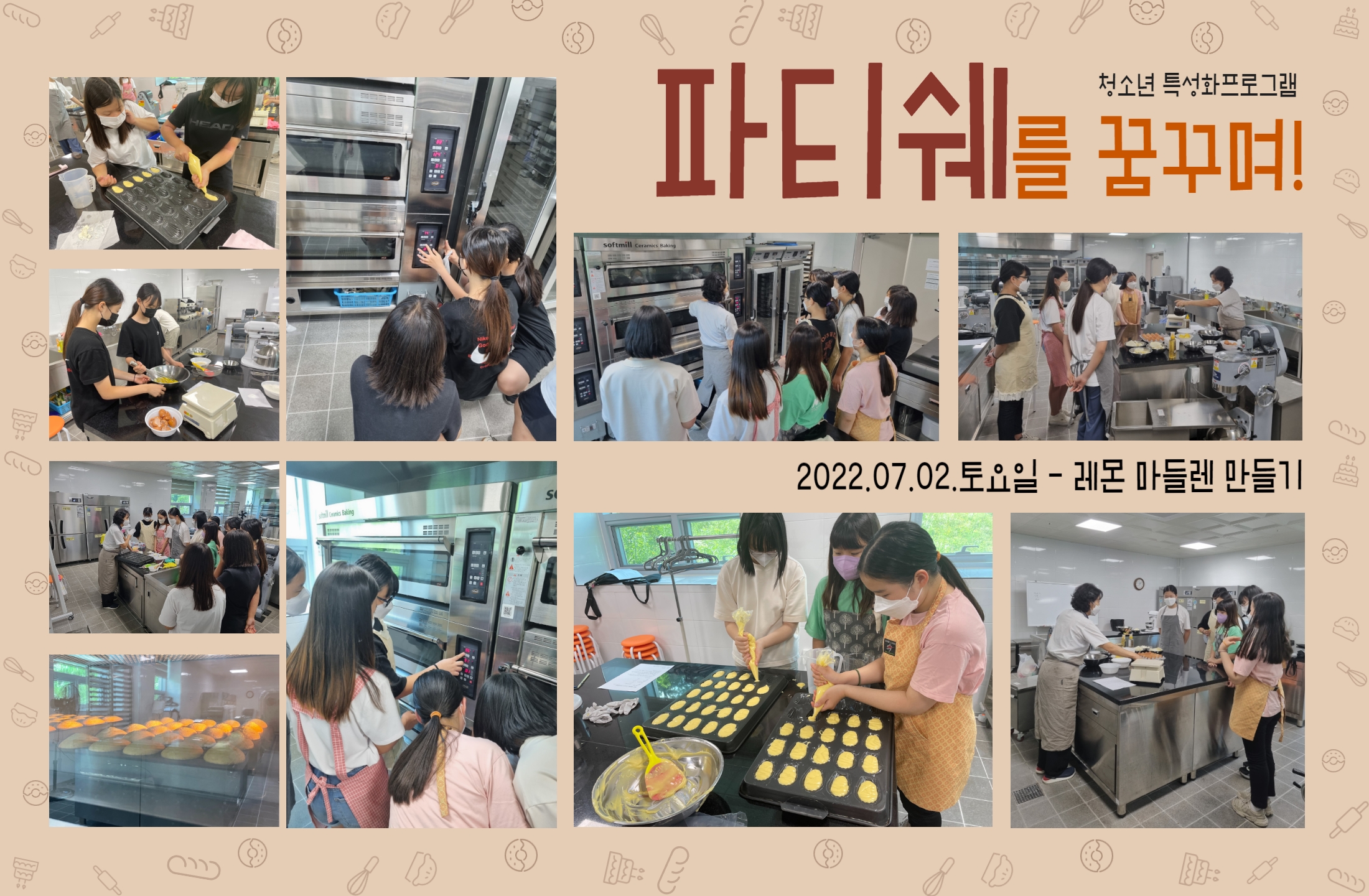 청소년 특성화 프로그램 - 파티쉐를 꿈꾸며 1회차(22.07.02) 작성자 관리자 등록일자 2022년 7월 7일 15시 51분 11초 조회 474 파티쉐1회차-22.07.02.토.jpg [ Size : 1.61MB , Down : 172 ] 미리보기 다운로드 목록보기
