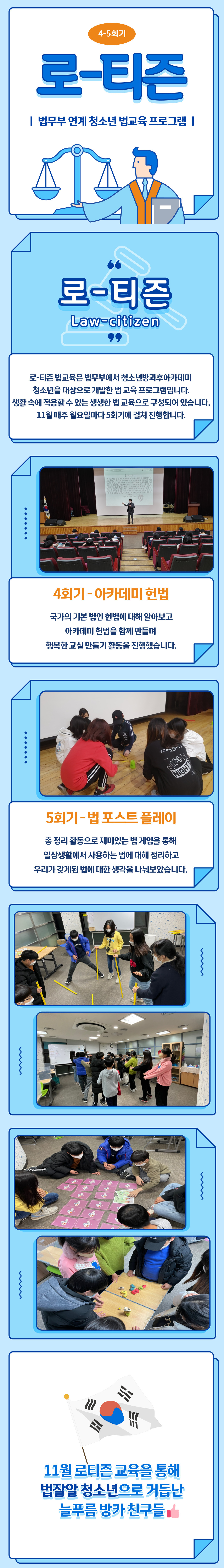 늘푸름방과후아카데미 법무부 연계 법 교육 '로-티즌' 4-5회기 작성자 관리자 등록일자 2021년 11월 30일 11시 30분 31초 조회 652 001.jpg [ Size : 174.33KB , Down : 145 ] 미리보기 다운로드 로티즌5회기.jpg [ Size : 1.67MB , Down : 200 ] 미리보기 다운로드 목록보기